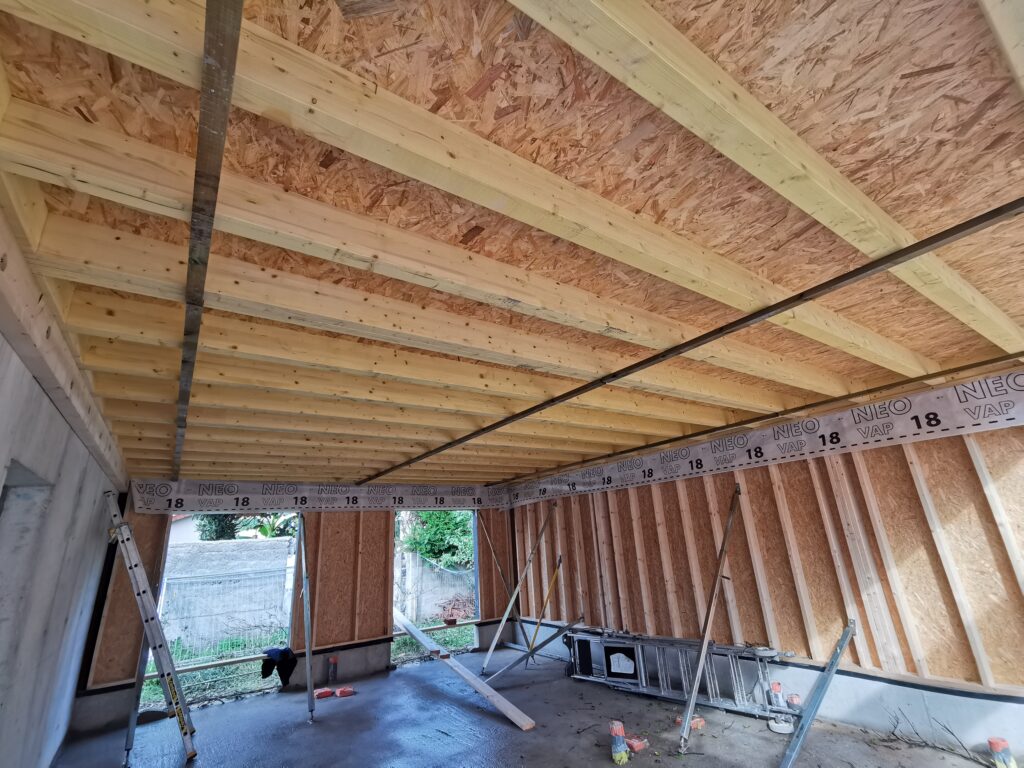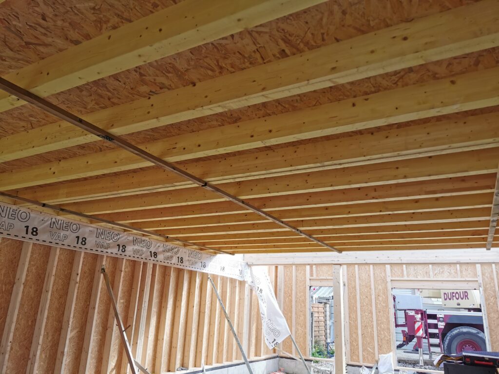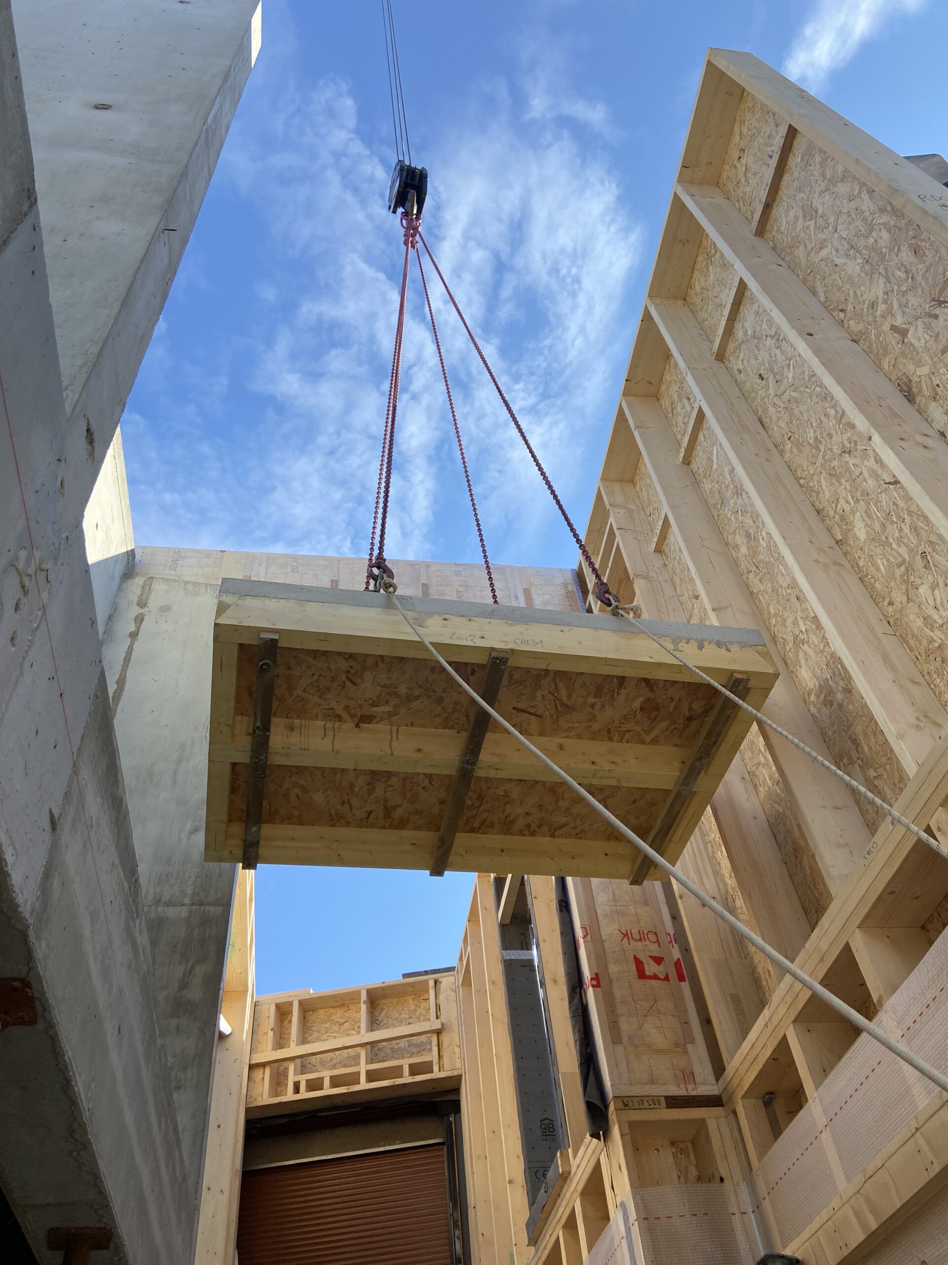 - Pose des refends en CLT et des murs à ossature bois, constituant l’ossature principale du bâtiment.
