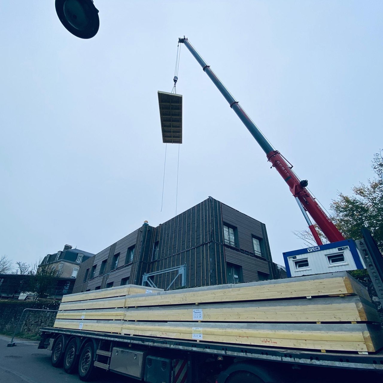 3. Mise en place des planchers HYBRIDAL, acheminés et levés en plusieurs caissons de grande dimension.